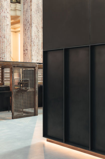 El hall prexistente propone piezas de escala humana como el mostrador ya mencionado, bancos y mesas auxiliares todos de mármol negro y las cajas de cobranza en bronce. Se utilizó una paleta de materiales nobles, de colores oscuros y gestos antropométricos sensibles con el usuario en contraste con la escala monumental del espacio y su ornamento.